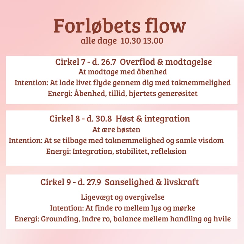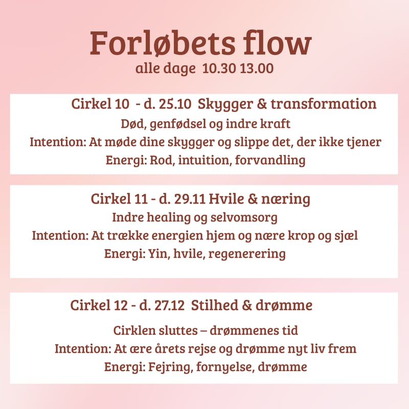 Hver cirkel begynder med ceremoniel cacao - en blid, hjerteåbnende plante, som støtter os i at lande i kroppen og forbinde os dybere med vores intuition. Herfra bevæger vi os ind i energiarbejde, meditation, delinger og små ritualer, der skaber forbindelse til os selv, hinanden og til det større felt.